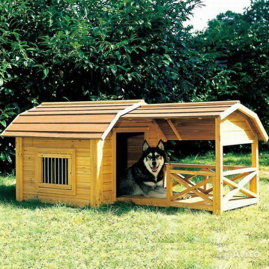 Собаки очень любят проводить время на улице, поэтому хорош вариант с выступающей крышей в виде навеса, которая поможет Вашему любимцу укрыться от солнца или дождя.