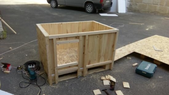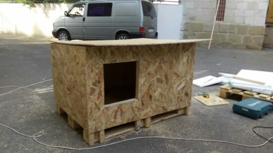 Но этот трудоемкий процесс можно облегчить если взять плиту ДСП или OSB. Тогда в основании следует оставить целый поддон, а стенки сделать из бруса и обшить его фанерой, ДСП или OSB. Потом всю конуру рекомендуется еще покрасить снаружи, чтоб минимизировать воздействие осадков на материал.