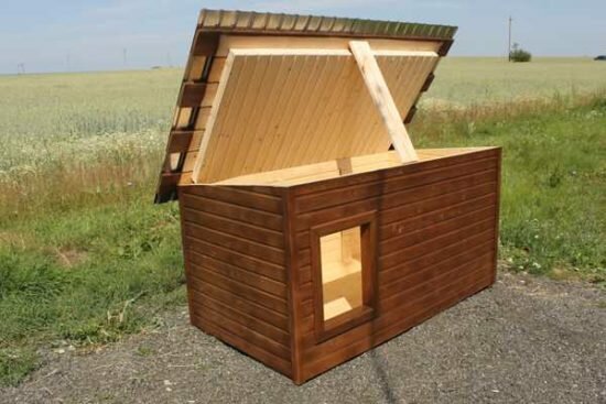 Также хорошим выбором будет съемная крыша, которую можно закрепить, например, на дверные петли. Это решение позволит без труда делать уборку внутри будки, обеззараживать стенки и пол от блох и прочих насекомых.