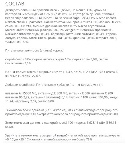 (Состав беззернового корма с индейкой и овощами, скрин с официального сайта производителя)